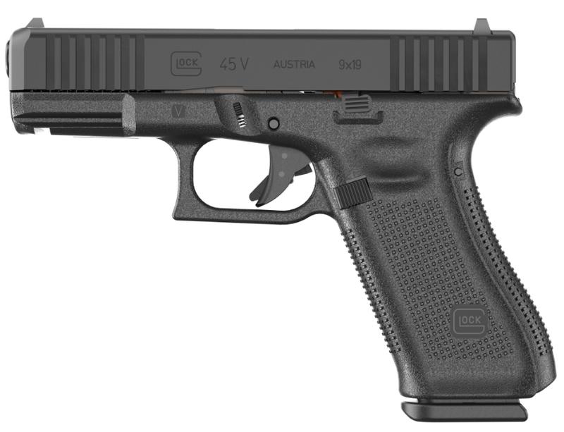 The Glock 45 V Crossover combines a compact slide with a full size frame. Featuring a flared magwell has a larger funnel; Glock Marksman Barrel (GMB) more aggressive polygonal rifling with a target-style crown and tighter chamber specs; ambidextrous slide stop levers offer increased ergonomics for left-hand shooters and shooting with the support hand; removal of finger grooves; Safe Action System, safeties disengage sequentially as the trigger is pulled and automatically re-engage when the trigger is released; enlarged floor plate makes it easier to pull the magazine free of the pistol and customizable frame size with backstraps in two sizes with beavertail. The multiple backstrap frame allows the users to change the circumference of the grip to fit their individual hand size.